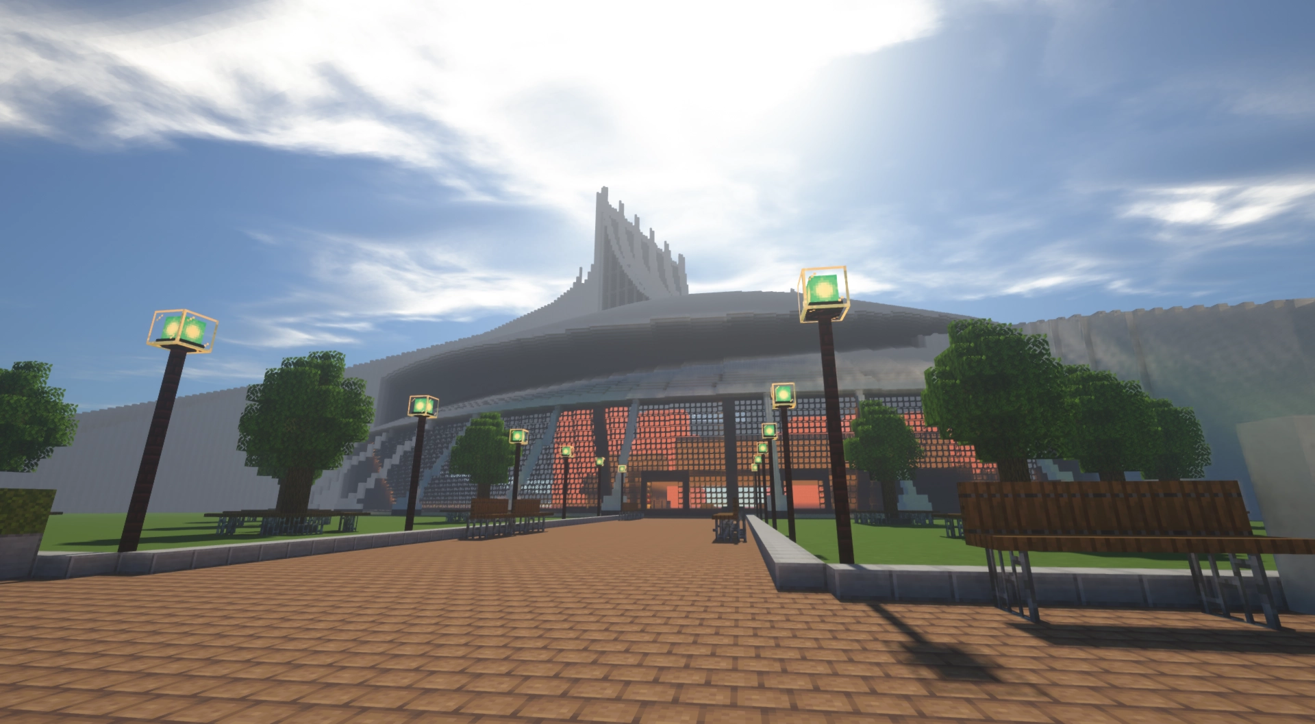 まず初めに、下層部分のガラスや第一の屋根、アリーナ手前の道、謎の三日月部分などをサーバー管理者kumagamesさん含むクリエイター複数名で製作しました。